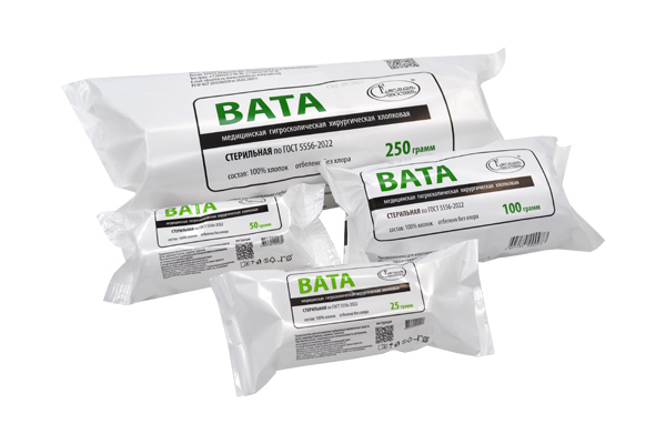 Вата медицинская гигроскопическая хирургическая стерильная по ГОСТ 5556-81, ГОСТ 5556-2022